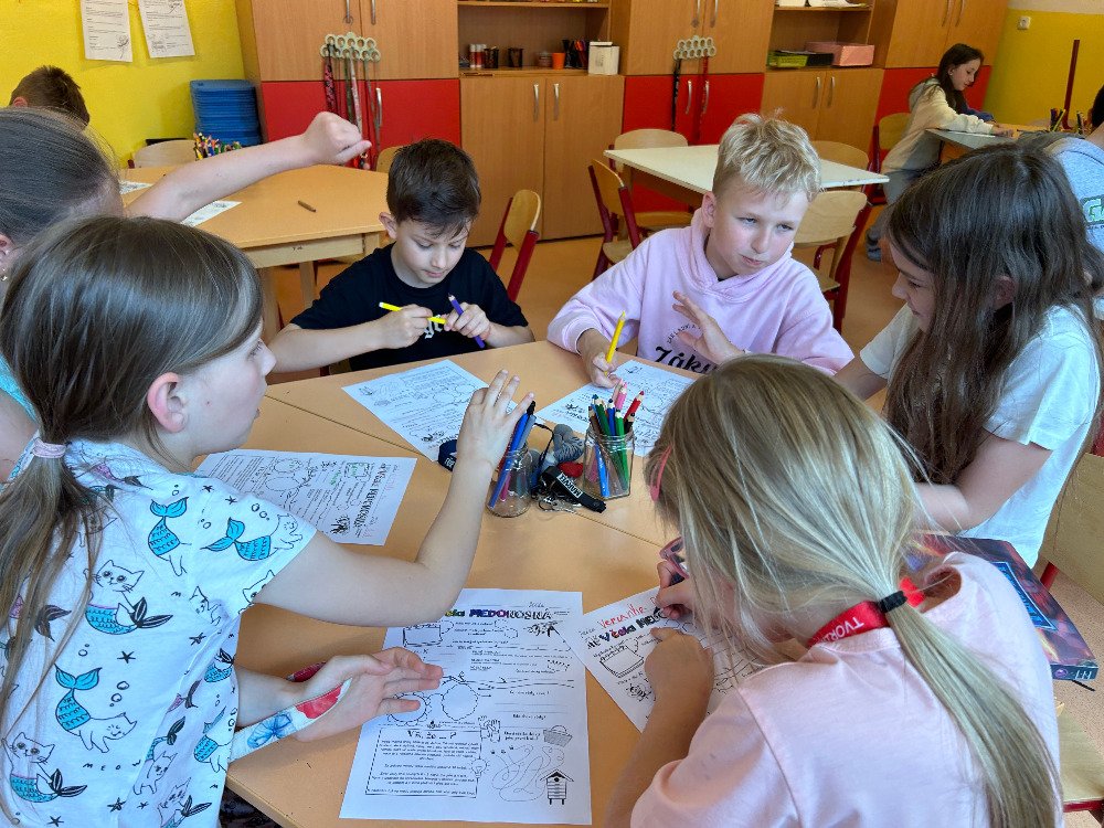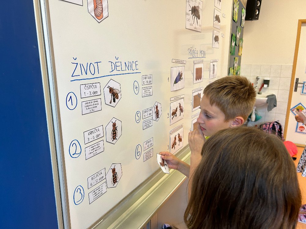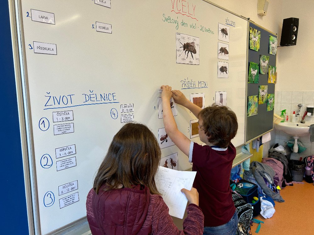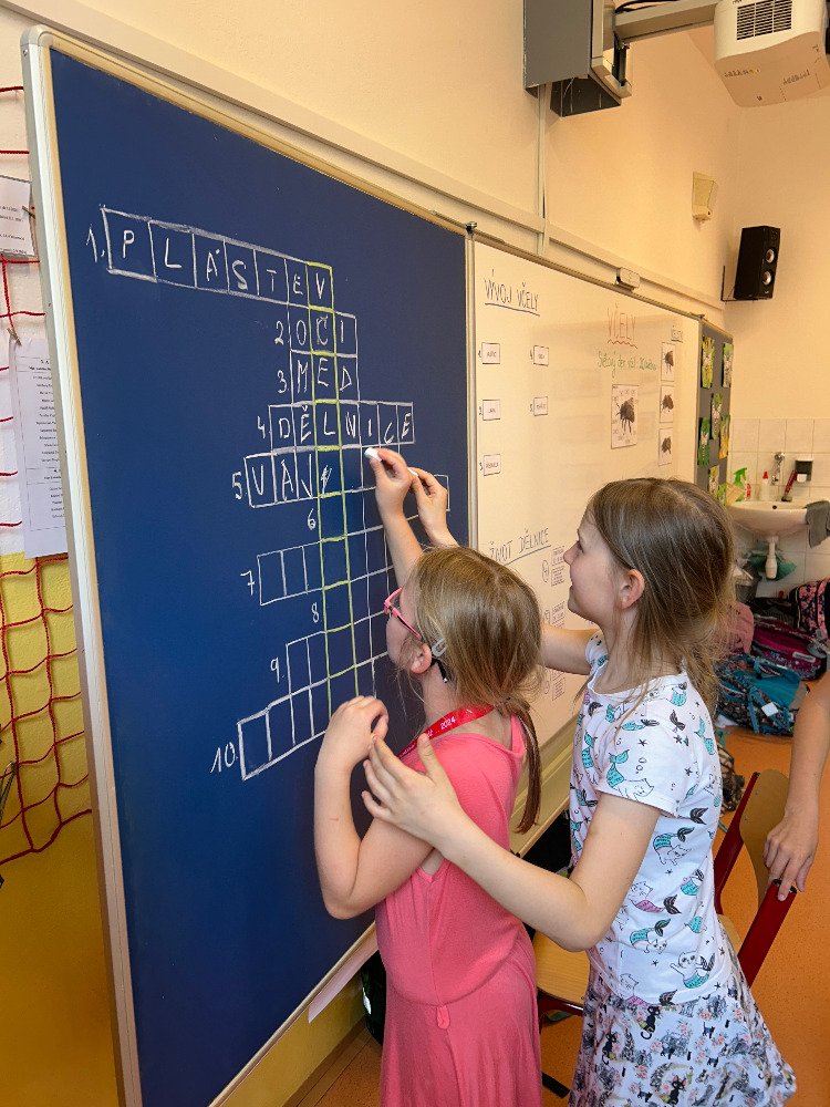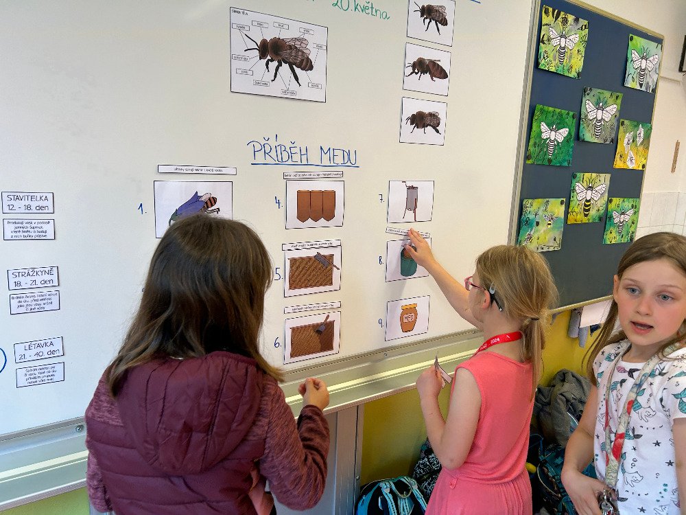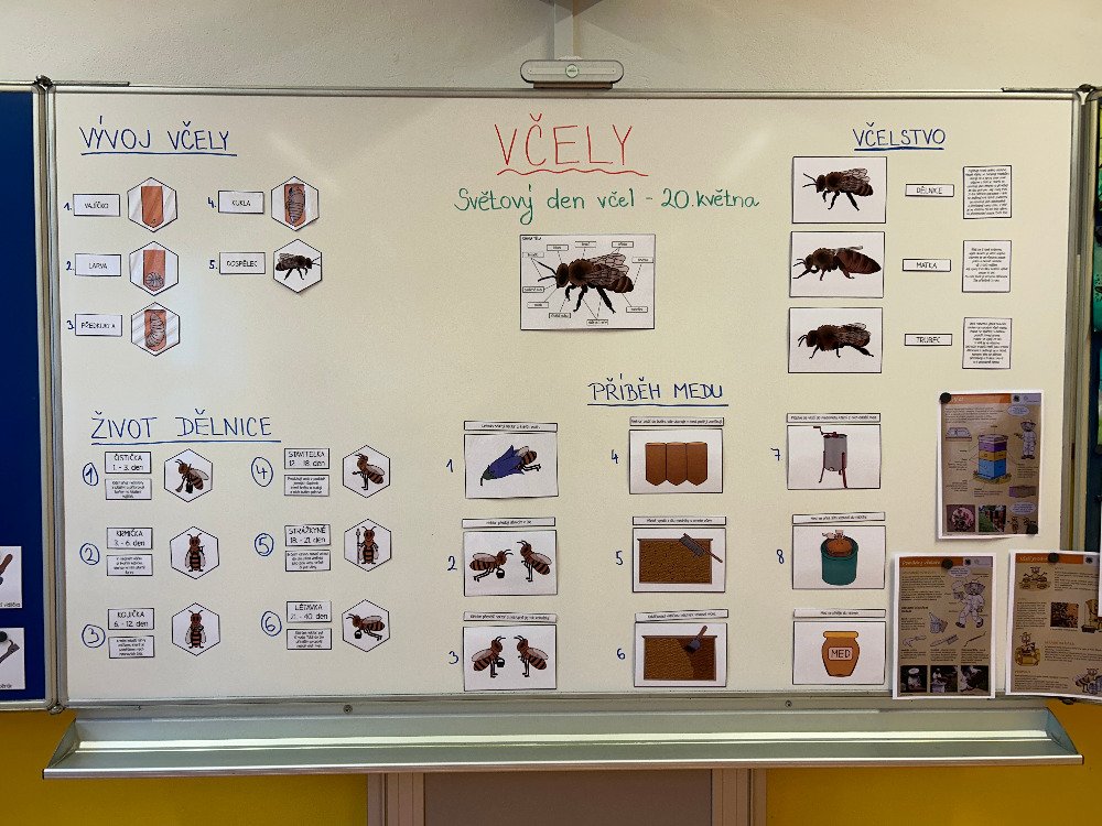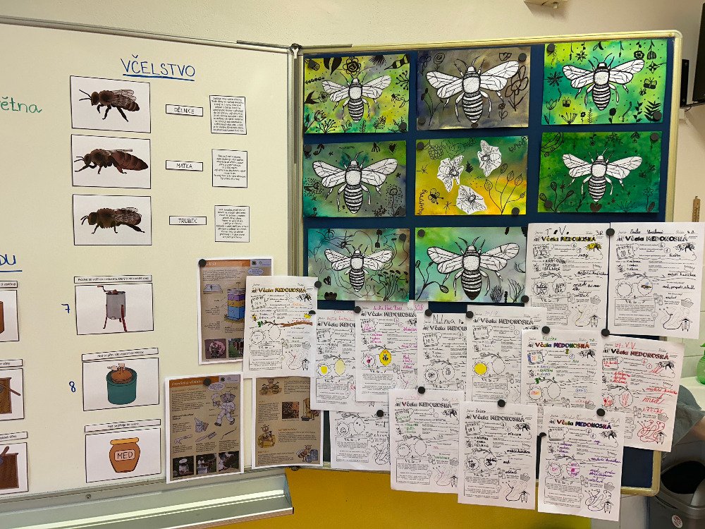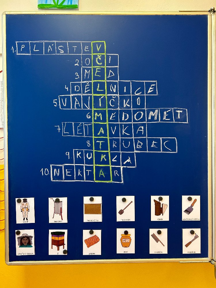 V týdnu od 20.5. - 24.5. jsme si s dětmi povídali o včelách a o životě v úle. K tomuto tématu vyprávěly děti i své vlastní zkušenosti s včelařstvím. Také jsme si pověděli, jak vzniká med. Děti seřazovaly text k obrázkům tak, aby jim vznikl příběh o vzniku medu. Dále se děti seznámily se životem včely dělnice v úle. Na toto téma jsme i tvořili, luštili křížovku a doplňovali naučný pracovní list.