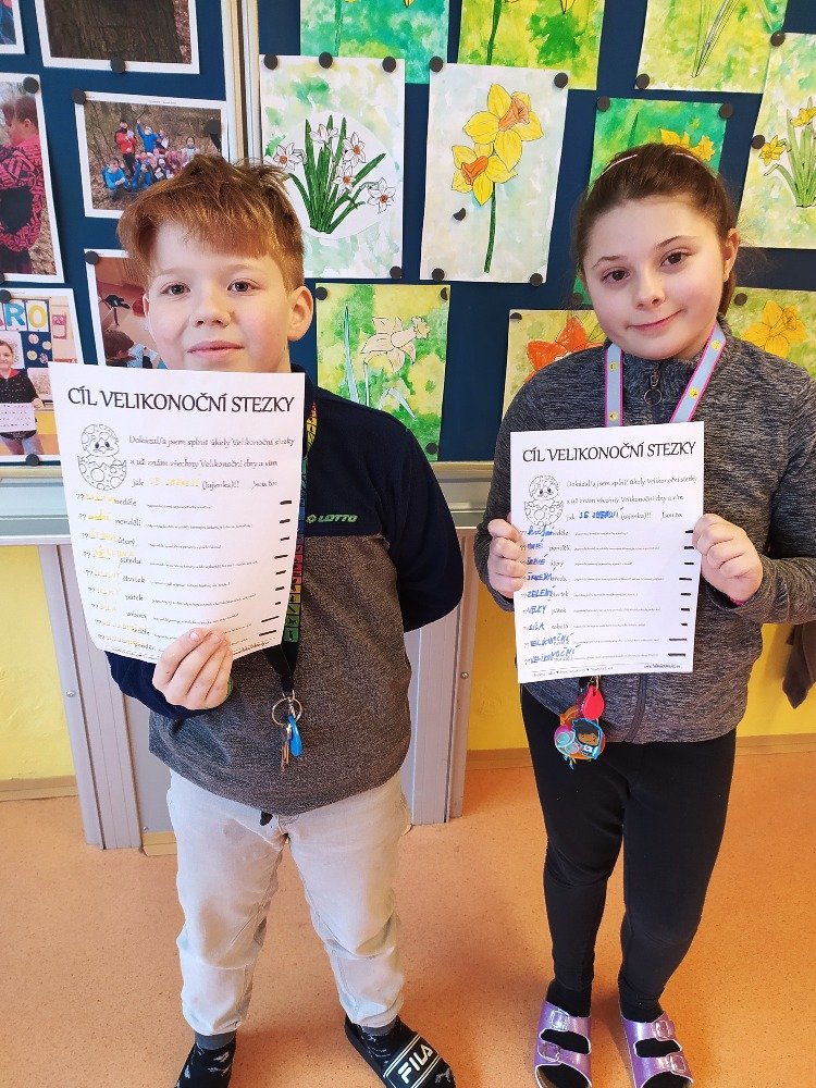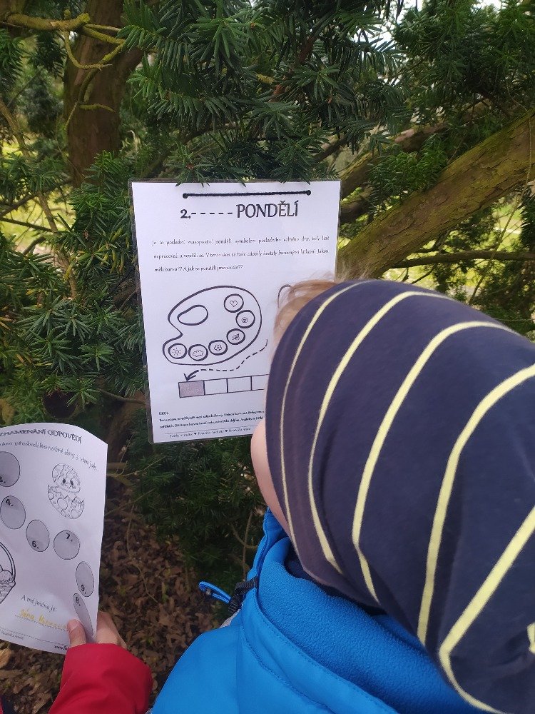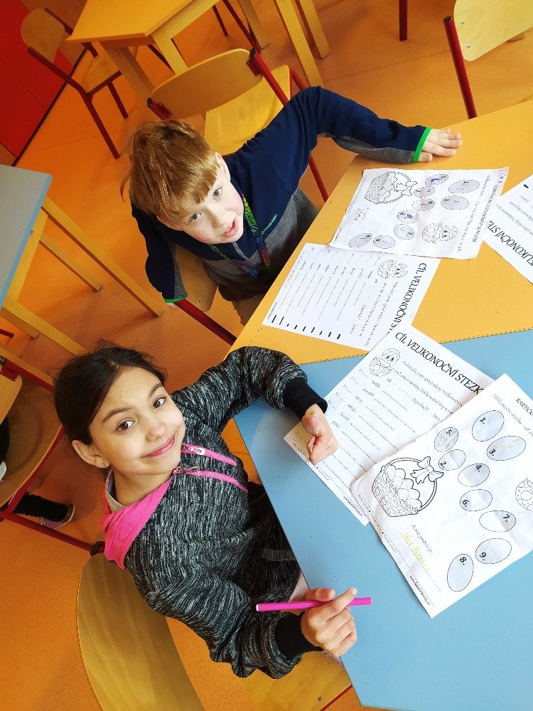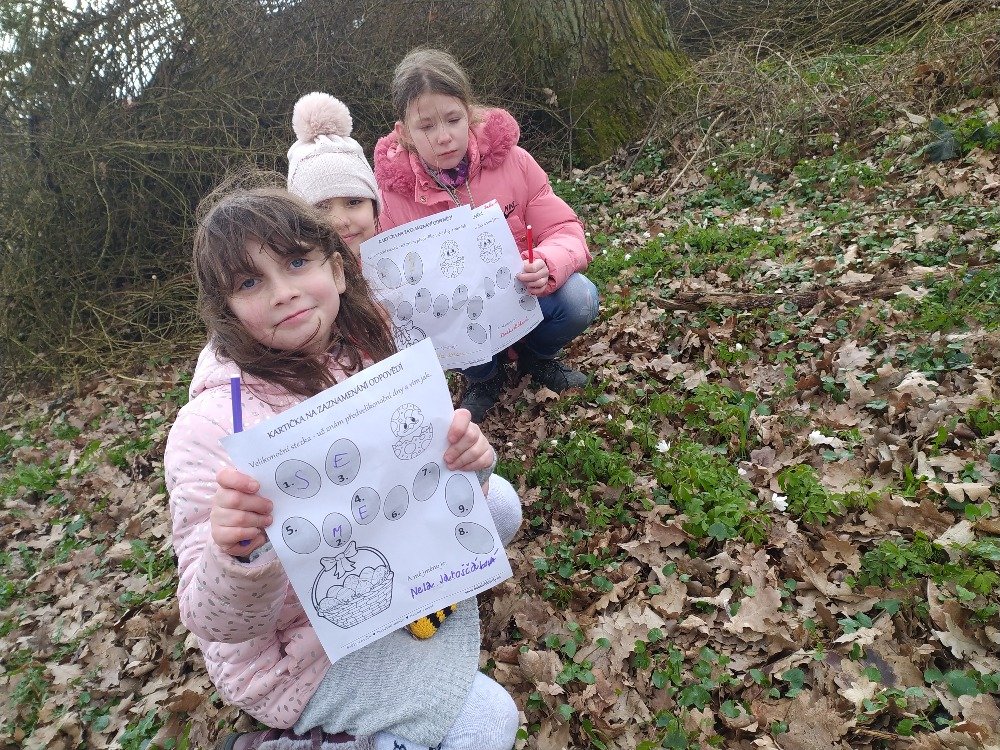 Měsíc duben jsme v naší družině začali Naučnou velikonoční stezkou v zámeckém parku. Velikonoční stezka byla situována tak, aby děti seznámila hravým způsobem s předvelikonočním časem. Děti procházely jednotlivá stanoviště a plnily úkoly tematicky zpracované podle názvu dní (Květná neděle, Šedivé úterý, Zelený čtvrtek, Modré pondělí, Škaredá středa, Velký pátek, Bílá sobota, Velikonoční neděle, Velikonoční pondělí).