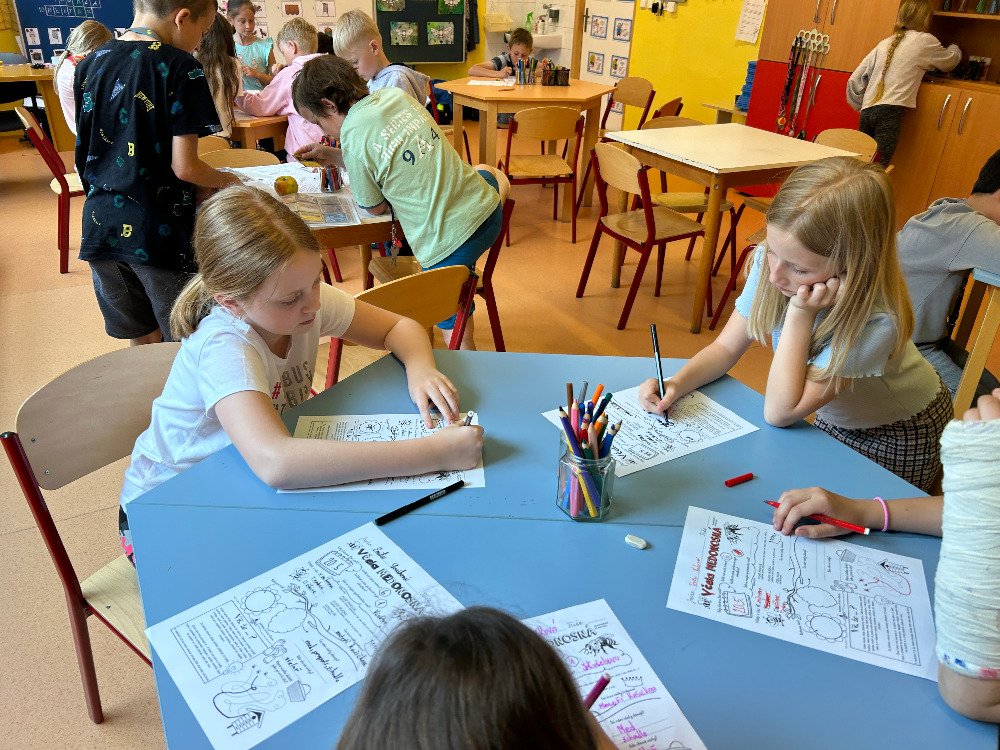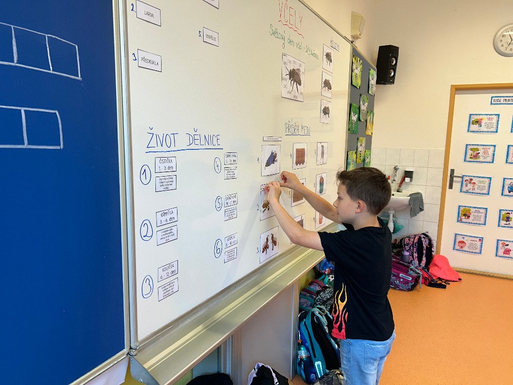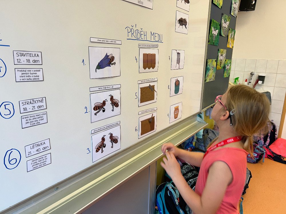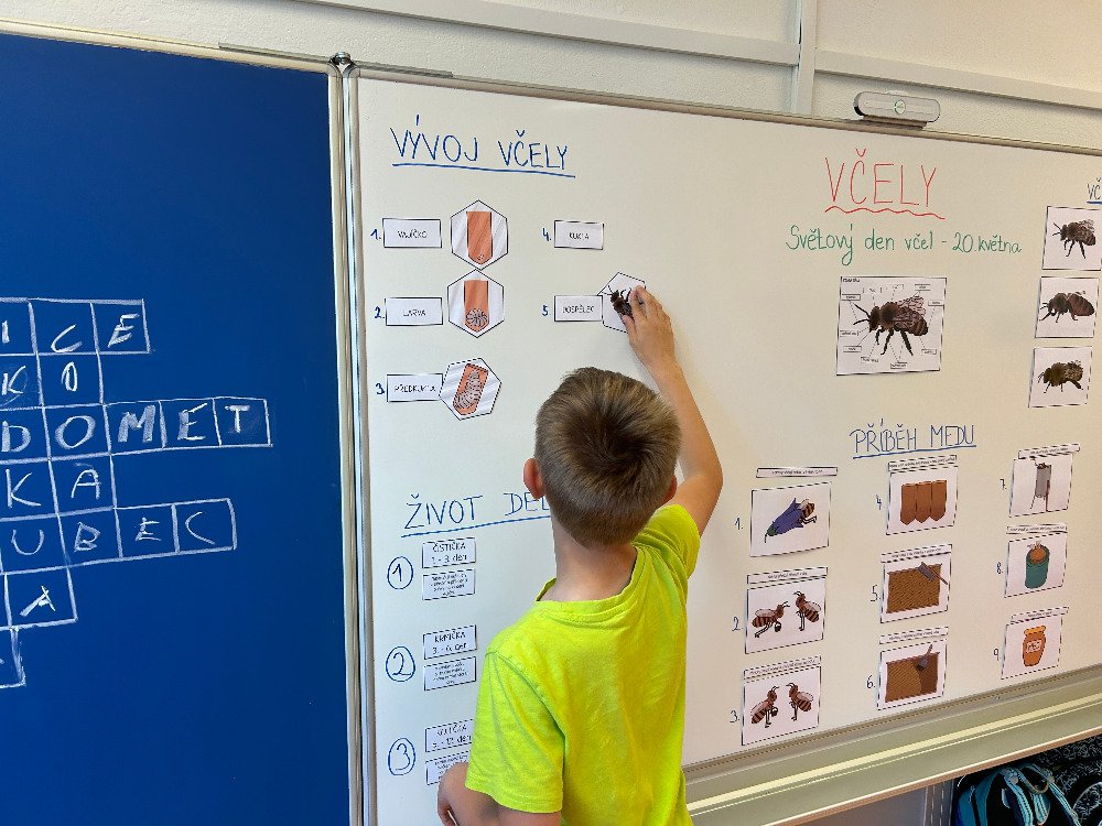 V týdnu od 20.5. - 24.5. jsme si s dětmi povídali o včelách a o životě v úle. K tomuto tématu vyprávěly děti i své vlastní zkušenosti s včelařstvím. Také jsme si pověděli, jak vzniká med. Děti seřazovaly text k obrázkům tak, aby jim vznikl příběh o vzniku medu. Dále se děti seznámily se životem včely dělnice v úle. Na toto téma jsme i tvořili, luštili křížovku a doplňovali naučný pracovní list.