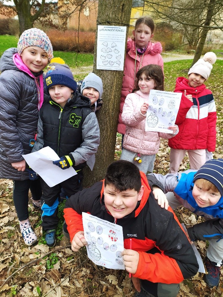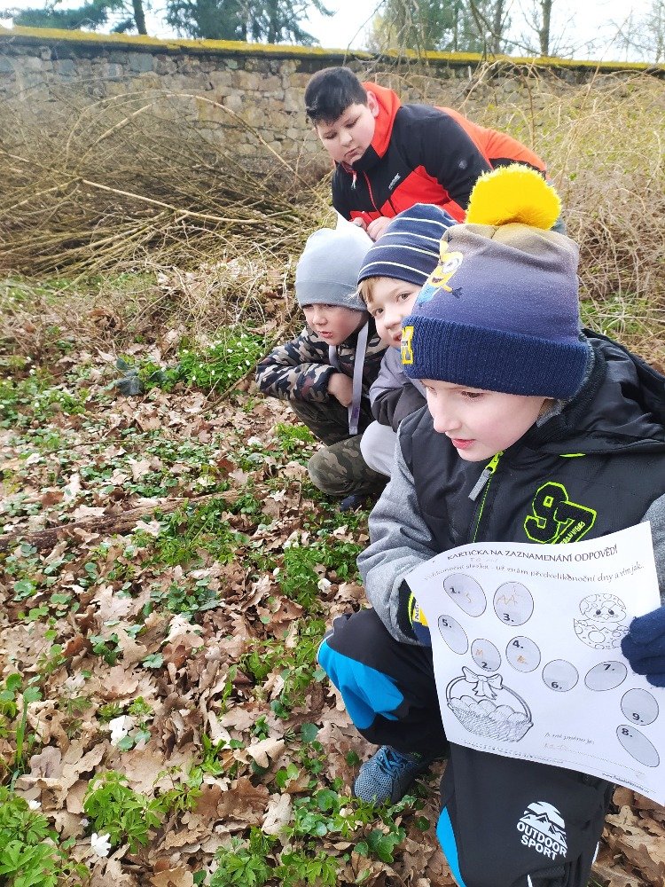 Měsíc duben jsme v naší družině začali Naučnou velikonoční stezkou v zámeckém parku. Velikonoční stezka byla situována tak, aby děti seznámila hravým způsobem s předvelikonočním časem. Děti procházely jednotlivá stanoviště a plnily úkoly tematicky zpracované podle názvu dní (Květná neděle, Šedivé úterý, Zelený čtvrtek, Modré pondělí, Škaredá středa, Velký pátek, Bílá sobota, Velikonoční neděle, Velikonoční pondělí).